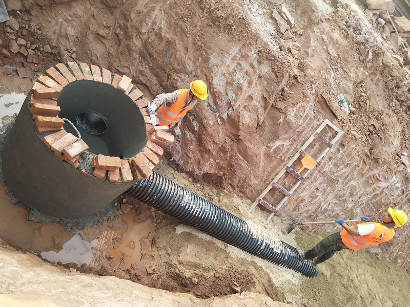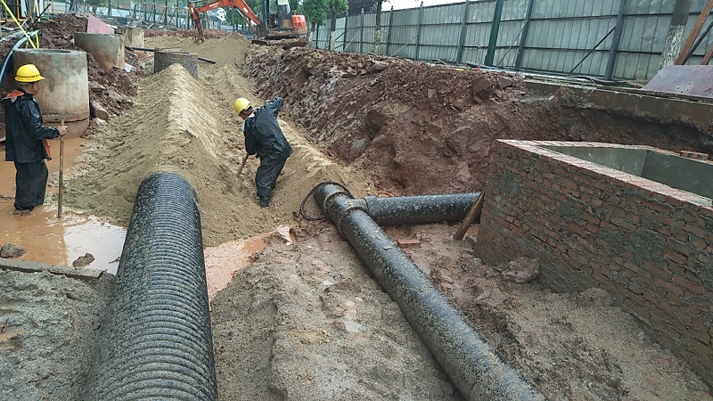 公司承接了百聯購物公園的小市政項目,項目主要由DN300球墨鑄鐵給水管道、DN600HDPE雙壁波紋雨水管道、DN400雙壁波紋污水管道、DN100PE中水管道及各種閥門井及檢查井組成,管道設計結構錯綜復雜、排列緊密,污水管道設計埋深甚至達到4~5米,整個項目又均為風化巖地貌,施工難度很大。加之工期正值端午前后,雨水充沛,大量暴雨也為施工帶來了不小的難度。施工期間,先后遇到了如管道作業面狹小四排管道施工無法同時推進、井面設計標高與園林地面標高無法統一、深基坑土方開挖及支護、甲方開業搶進度等一系列問題。但是,在我們星澤公司項目部全體同仁的共同努力下,以發揚不怕苦、不怕累的艱苦奮斗的精神,本著客戶第一、質量第一的理念,在保證安全和工期的前期下,順利完成施工任務,項目也得到了業主及總包的充分肯定。