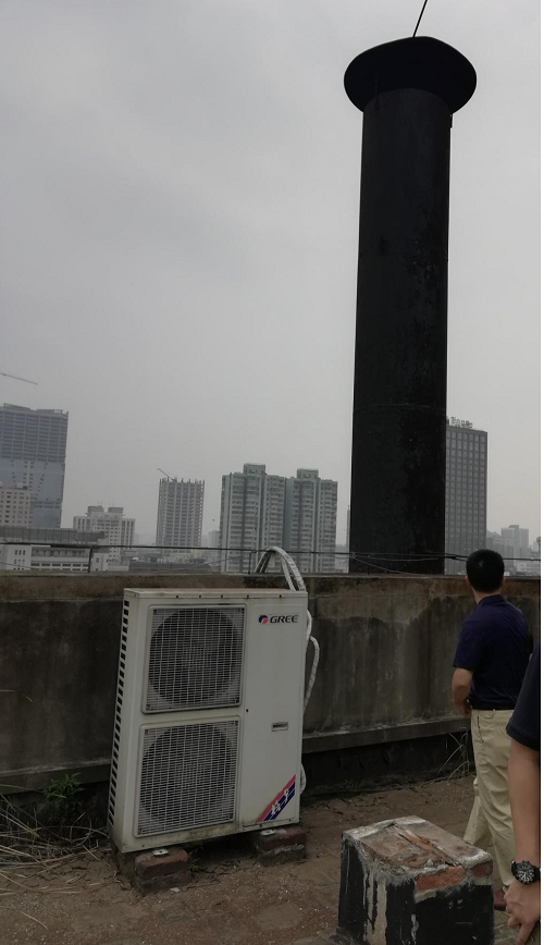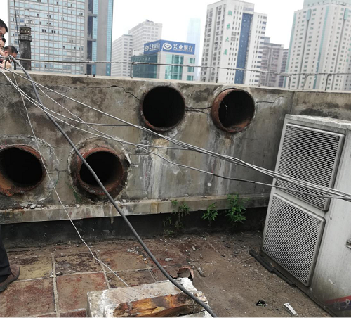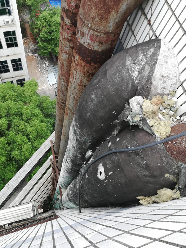 原煙囪(焊接鋼管),管徑約為900mm。沿小區2棟北外墻靠東豎向安裝,從負一層一直到樓頂,總高度約36米。