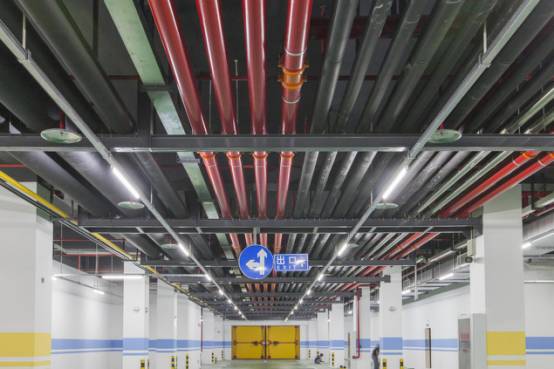 車庫管線排布美觀,聯(lián)合支吊架安全可靠,管道居套管中,燈帶線槽平直,噴淋布置間距一致,標識清晰。