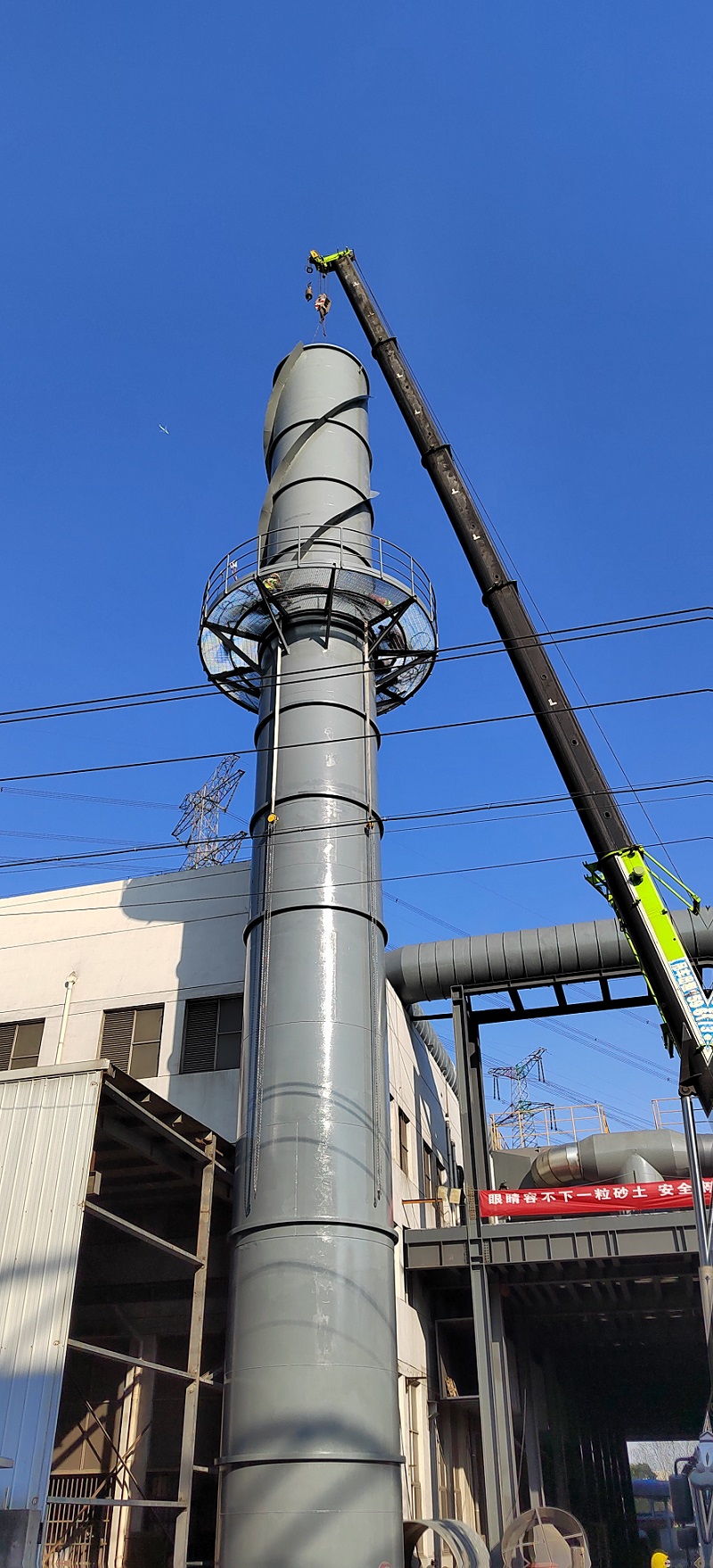 我司作為專業分包安裝單位,負責的項目內容有:三個直徑分別為3.4米4米、4.6米,高度分別為1個8米和2個13米的洗滌塔的制作安裝;兩個直徑分別為2.4米和2.6米的高度均為30米的煙囪制作安裝;甲供6臺大型活性碳吸附箱就位安裝,每臺重量超過15噸,甲供10臺過濾器就位安裝每臺重量也超過6噸,安裝就位高度都是在標高9米的鋼平臺上。還有6臺大功率的風機,其中最大兩臺風量超過17萬;將所有四供設備、洗滌塔、過濾器、吸附箱、風機等用大尺寸風管連接,最大的直接達到了2米,安裝標高16.5米,現場都是用大型吊車安裝就位;廢氣處理需要用的水管道、加藥系統安裝,所有水管道,廢氣管道和設備均有數據監控,要實現自動控制設備的運行,監控運行情況等。除甲供設備外,其他均為我方制作安裝就位。