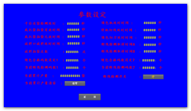 1、平臺送袋延時—是指缺袋狀態下,整摞空袋送袋到位的確認時間,此項參數的意義在于防止信號檢測到有袋而袋沒到位而產生誤吸動作。