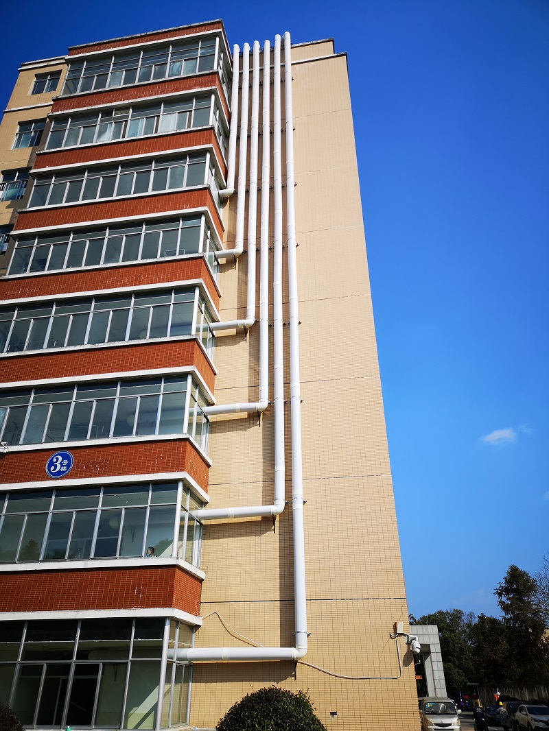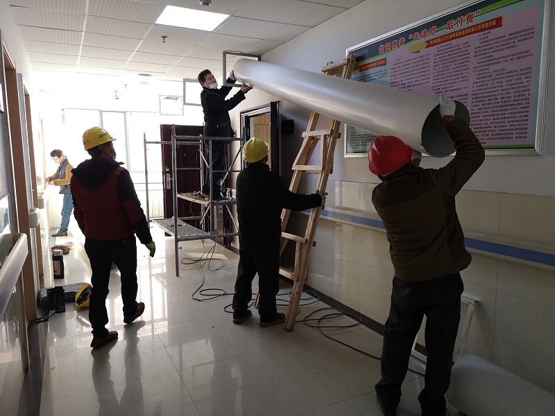 在現場指揮部的緊密組織下,我們迅速調集路口鎮周邊班組50名工人,財務采購排風電話、微信到處尋找風管材料和配件于下午五點到達工地,工人師傅連夜加班,把進度往前趕,為爭取第二天基本完成整棟八層的公共區域新風管道安裝卯足了干勁。