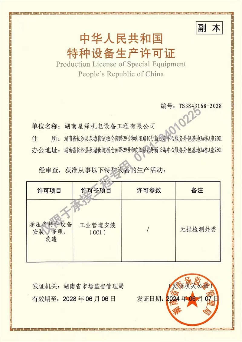 熱烈祝賀湖南星澤 機(jī)電設(shè)備工程公司取得工業(yè)管道安裝GC1最高資質(zhì)!成績(jī)來(lái)之不易,感謝省市縣市場(chǎng)監(jiān)督特種設(shè)備行政管理部門和協(xié)會(huì)給予星澤大力支持,感謝星澤全體員工團(tuán)結(jié)拼搏,不畏艱難,敬業(yè)奉獻(xiàn)的忘我工作。我們要珍惜、愛(ài)護(hù)企業(yè)的核心成果,在項(xiàng)目管理中始終以謙卑之心,求真務(wù)實(shí),精益求精的職業(yè)責(zé)任感和神圣使命感,強(qiáng)化TSGD0001-2009《壓力管道安全技術(shù)監(jiān)察規(guī)程》為基本準(zhǔn)則指導(dǎo),把《特種設(shè)備生產(chǎn)單位落實(shí)質(zhì)量安全主體責(zé)任監(jiān)督管理規(guī)定》認(rèn)真落實(shí)到質(zhì)量安全體系運(yùn)行中、確保項(xiàng)目質(zhì)量安全,滿足客戶需求,努力建設(shè)星澤著名品牌,鑄造星澤行業(yè)標(biāo)桿。