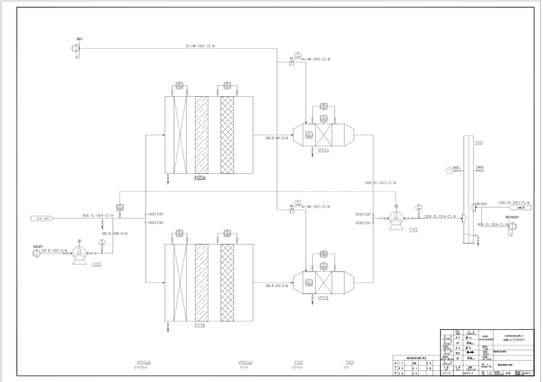 設計規模:干式過濾器設計處理氣量85000m3/h,4套;活性炭吸附箱設計處理氣量45000m3/h,8套。34萬m3/h煙囪,Ф2800×H30000,1套。